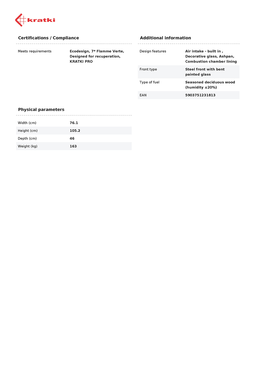 – a triple system of combustion chamber aeration contributes to the high efficiency of the combustion process, the extension of the combustion flow through a system of two deflectors and a flue outlet screen contributes to lowering the temperature of the fumes, which translates into greater effectiveness of the combustion process and lower chimney losses,