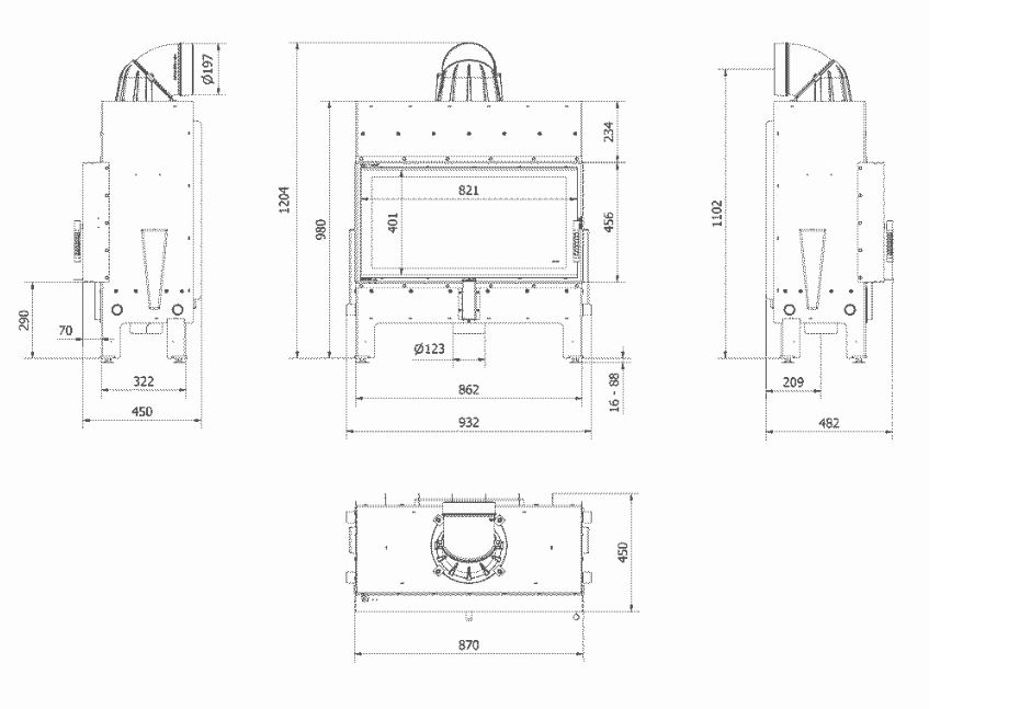 Secondary air is distributed to the rear and side walls of the combustion chamber. It ensures efficient combustion of the gases, reducing smoke and the emission of harmful substances into the environment.