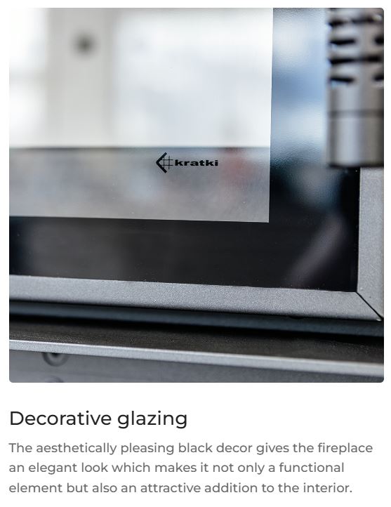 FLOKI combines elegant aesthetics with advanced combustion technology, blending perfectly with any modern interior. The elegant design with decorative GLASS glass not only visually enlarges the space, but also allows you to enjoy the view of the dancing flames. Lining the combustion chamber with TERMOTEC material ensures longer temperature maintenance and more efficient combustion, which increases the temperature in the firebox and aids the afterburning of fuel particles, minimising harmful emissions.