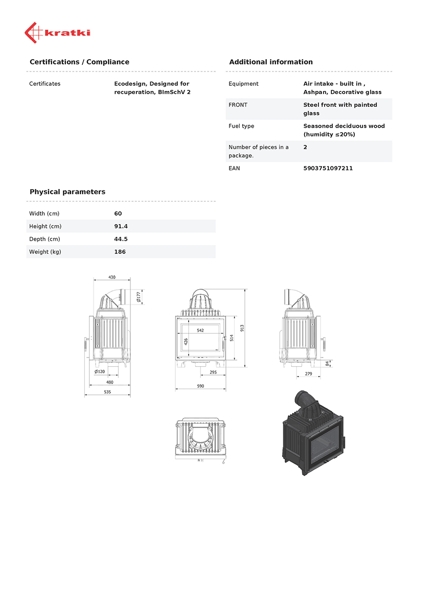 Triple system of combustion chamber’s air venting: primary air – secondary air supplied under the grate through holes in a back wall. Additionally clean glass system designed (air curtain).