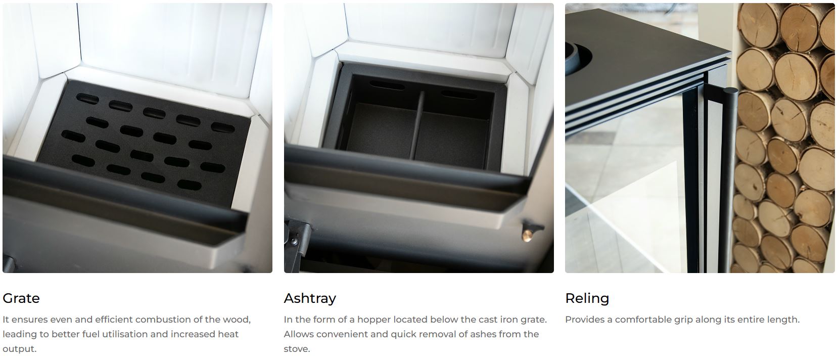– deepened combustion chamber accommodates more wood and prevents ash from spilling into the room when refuelling,