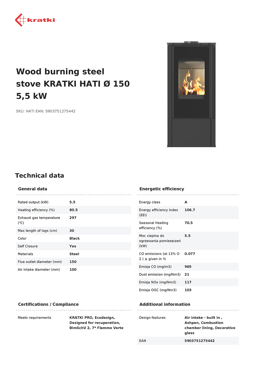 Wood burning steel stove KRATKI HATI Ø 150 5,5 kW