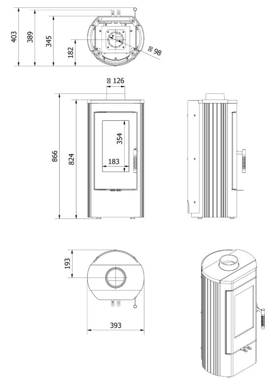 - Outside air intake – 100 mm diameter connector with convenient connection from the bottom or back of the stove,
