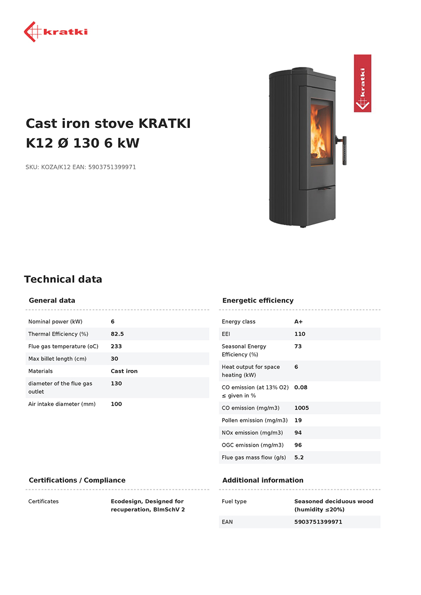 The stove’s high-quality cast iron construction allows for extremely efficient and – crucially – long-lasting heat release, even after the fire has been completely extinguished. The K12 guarantees thermal comfort and economical fuel use. The technical solutions used, including the exhaust gas post-combustion system, increase the device’s efficiency and make heating more environmentally friendly.