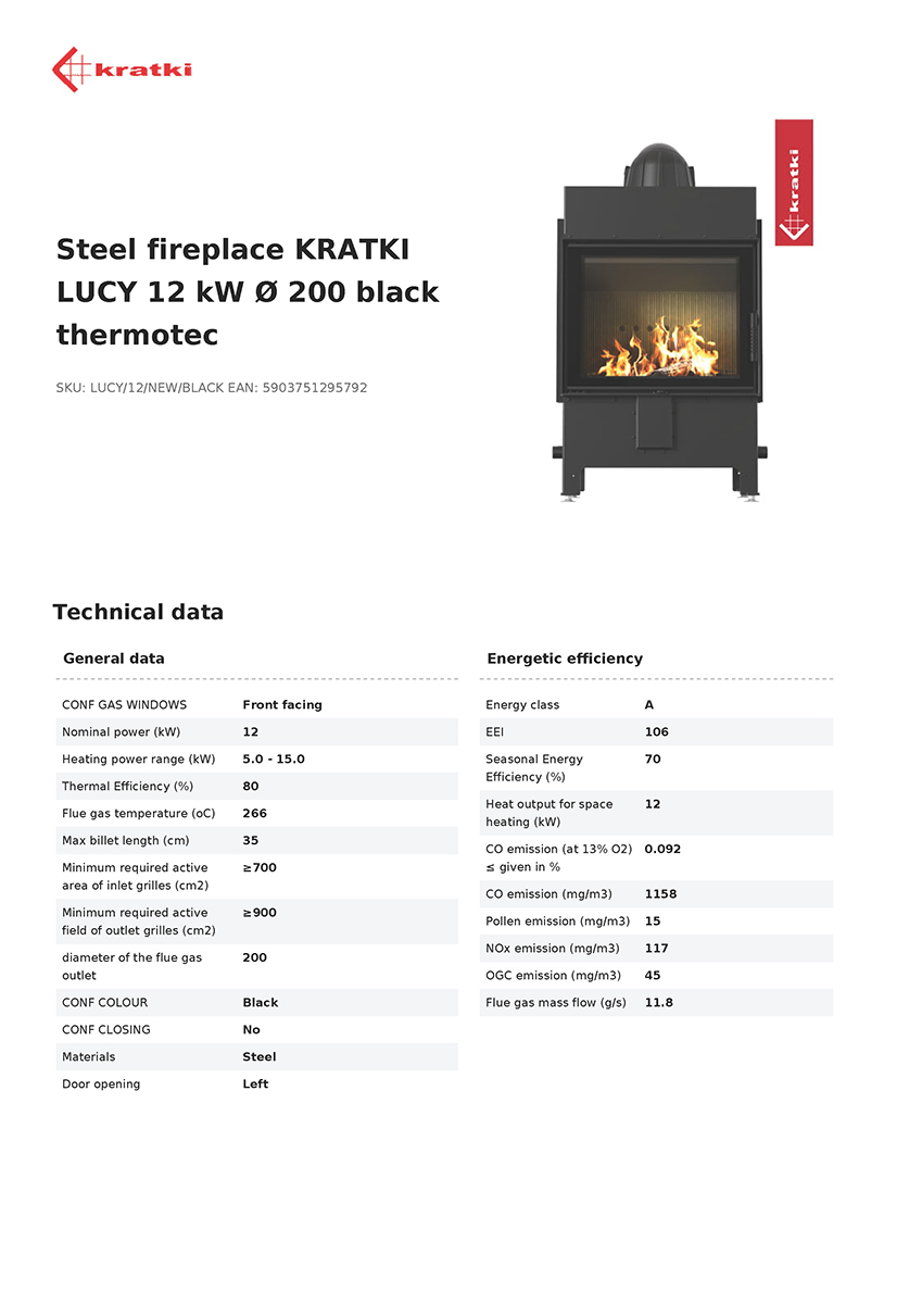 Steel fireplace KRATKI LUCY 12 kW Ø 200 black thermotec
