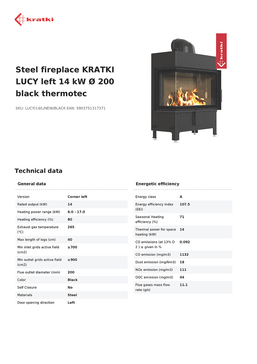 LUCY – The Queen of Fireplaces from the KRATKI PRO line LUCY represents a new era in the world of fireplaces, combining innovative technology with timeless elegance. This flagship product of the KRATKI PRO line has undergone a carefully planned metamorphosis to offer even more possibilities and higher user comfort. – Automated welding line ensuring perfect sealing and stability – Reinforced construction with a 5 mm front frame and 4 mm internal steel fence – Innovative Termotec lining with ribbed surface (available in white or black) – Deepened bottom plate increasing combustion chamber capacity and preventing ash escape – Ribbed Termotec lining not only adds elegance but also effectively accumulates heat, raising the temperature in the furnace The LUCY control system has been designed with maximum user convenience in mind. Control with a single airflow regulator allows intuitive control of the combustion process, while the well-thought-out cleaning system with removable ash pan and cast iron grate facilitates daily maintenance. Stability is ensured by adjustable legs, and integrated transport stubs significantly simplify the installation process. – Elegant glass with decorative pattern – Ergonomic, perforated handle resistant to overheating – Possibility to install dedicated blends – modern decorative frames LUCY is not just a fireplace – it’s a center of home warmth that harmoniously combines functionality with elegant design. Every detail has been carefully thought out to ensure not only effective heating but also reliability and satisfaction of use for many years. It’s a choice for the most demanding – a perfect combination of modern technology and timeless aesthetics.