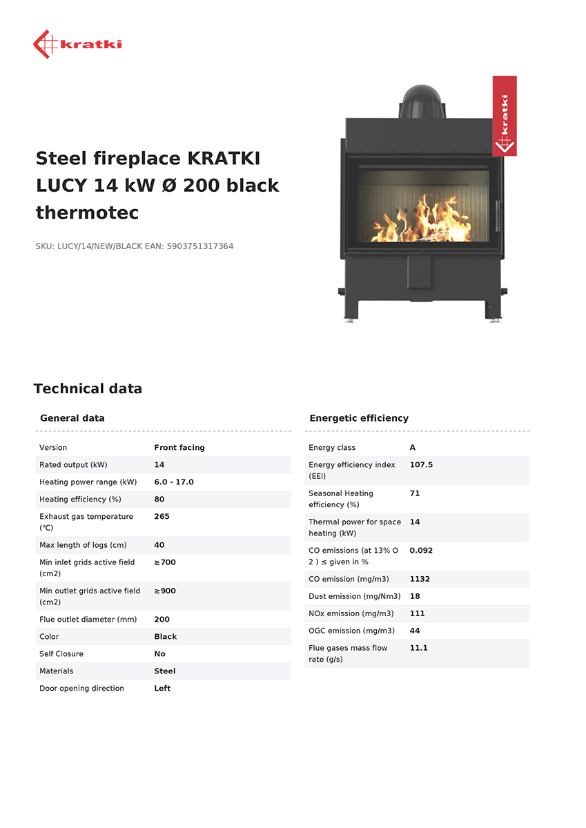 Steel fireplace KRATKI LUCY 14 kW Ø 200 black thermotec