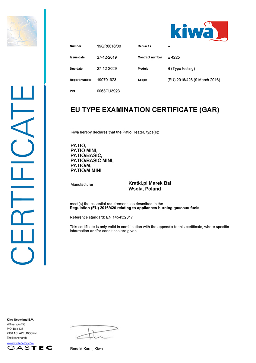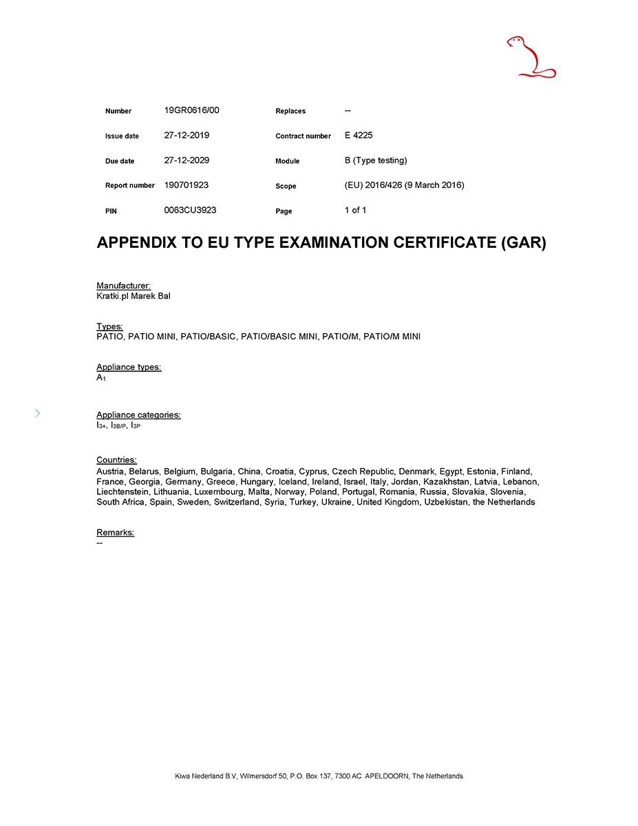 The PATIO is powered by liquid gas from a cylinder. The lower part of the device casing is made of steel, covered with powder paint. This makes the PATIO resistant to damage. Tempered glass of 4 mm thickness is used in the device.